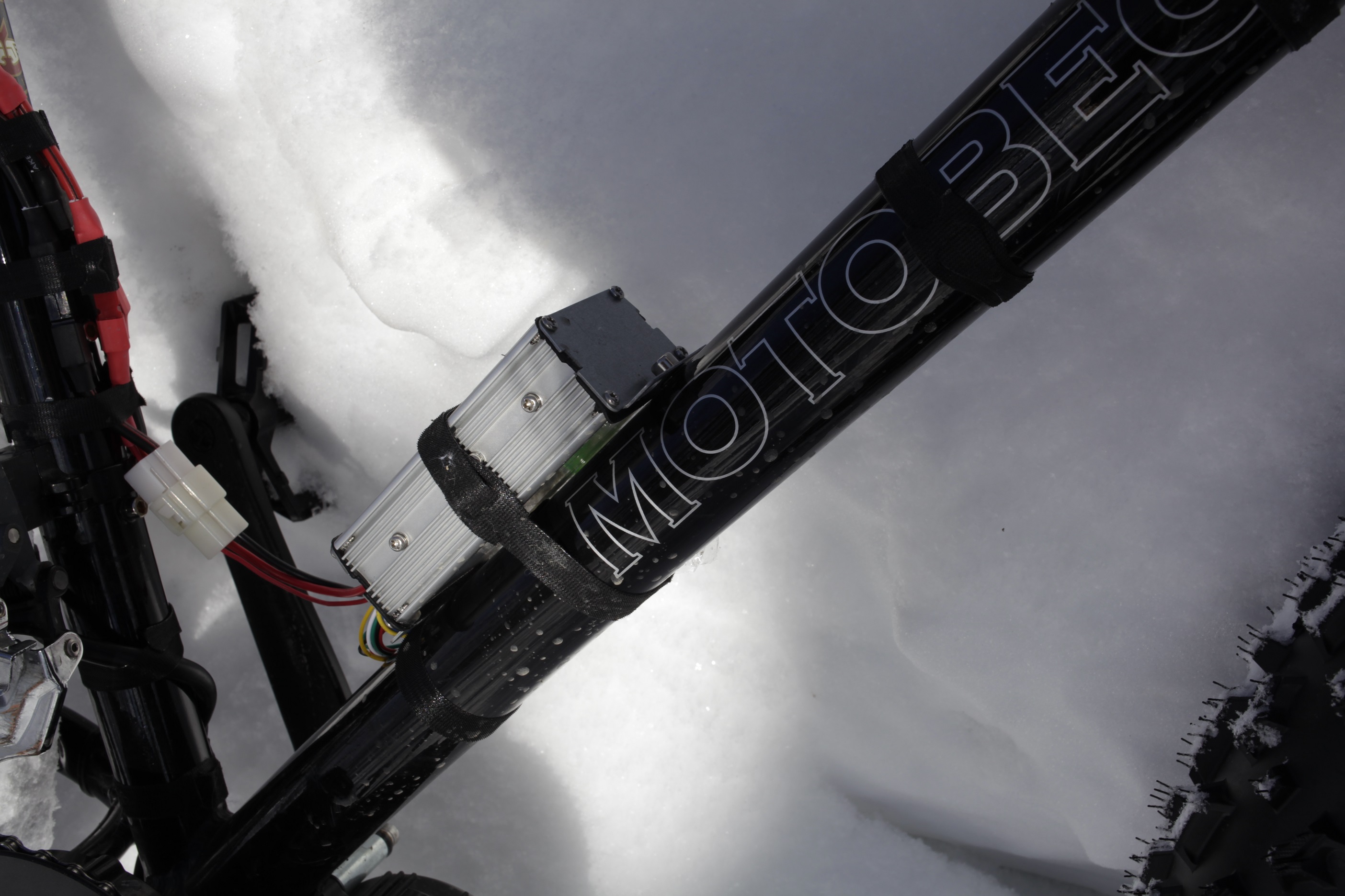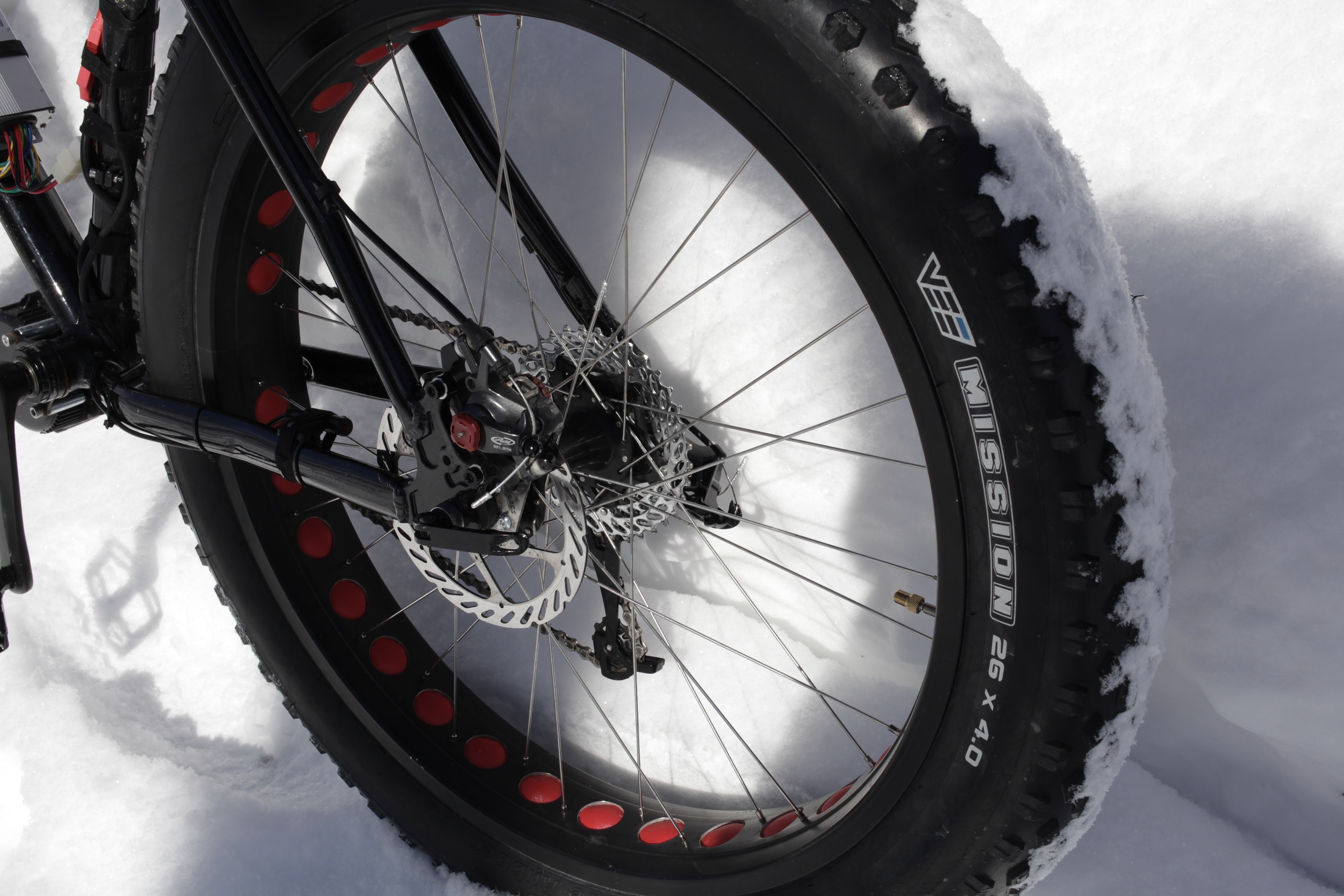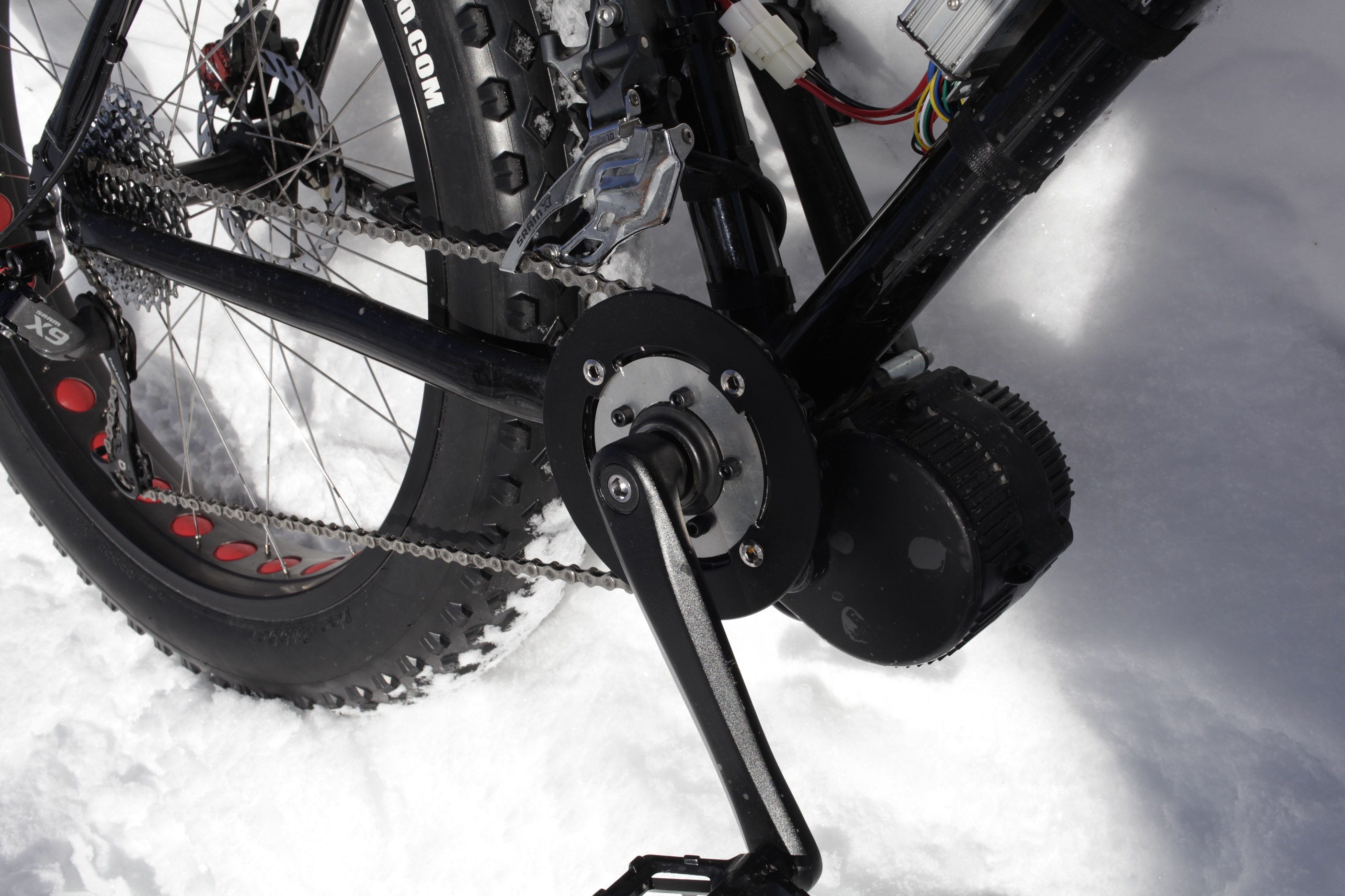 While my initial ideas about the importance of AWD on a snow bike were wrong, it took me several AWD builds to realize this. From this point I plan on experimenting with the use of skis to keep the bike from sinking down in deep powder and for the most part will probably totally give up on AWD. In my opinion Hub motors have no place on bikes designed for the snow, mid drives are the only way to go. You spend most of your time moving at 5mph or less and powering through powder will cause a lot of trouble with any hub motor I’ve seen on the market. The fat bike tire diameter is too big and the gearing is not enough to power these tires through hardly any snow at all. The best build I’ve done yet is my $900 ‘Sun Kiss’ DIY 42lb conversion found here out of a Deadeye Monster that takes about 4 hours start to finish.