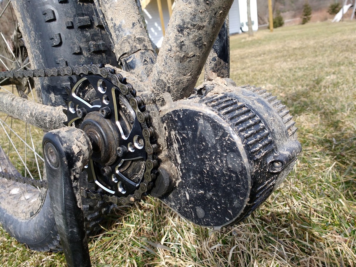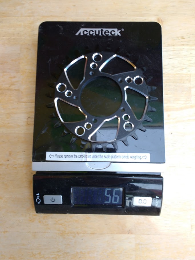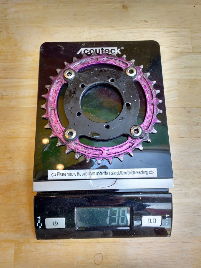 The weight is simply astounding, nothing else I’ve found even comes close. The Biktrix adapter and 34T Raceface chainring that this replaced weighed in at a hefty 138g, more than twice what the Mighy Mini 30T BBS02 chain ring did.