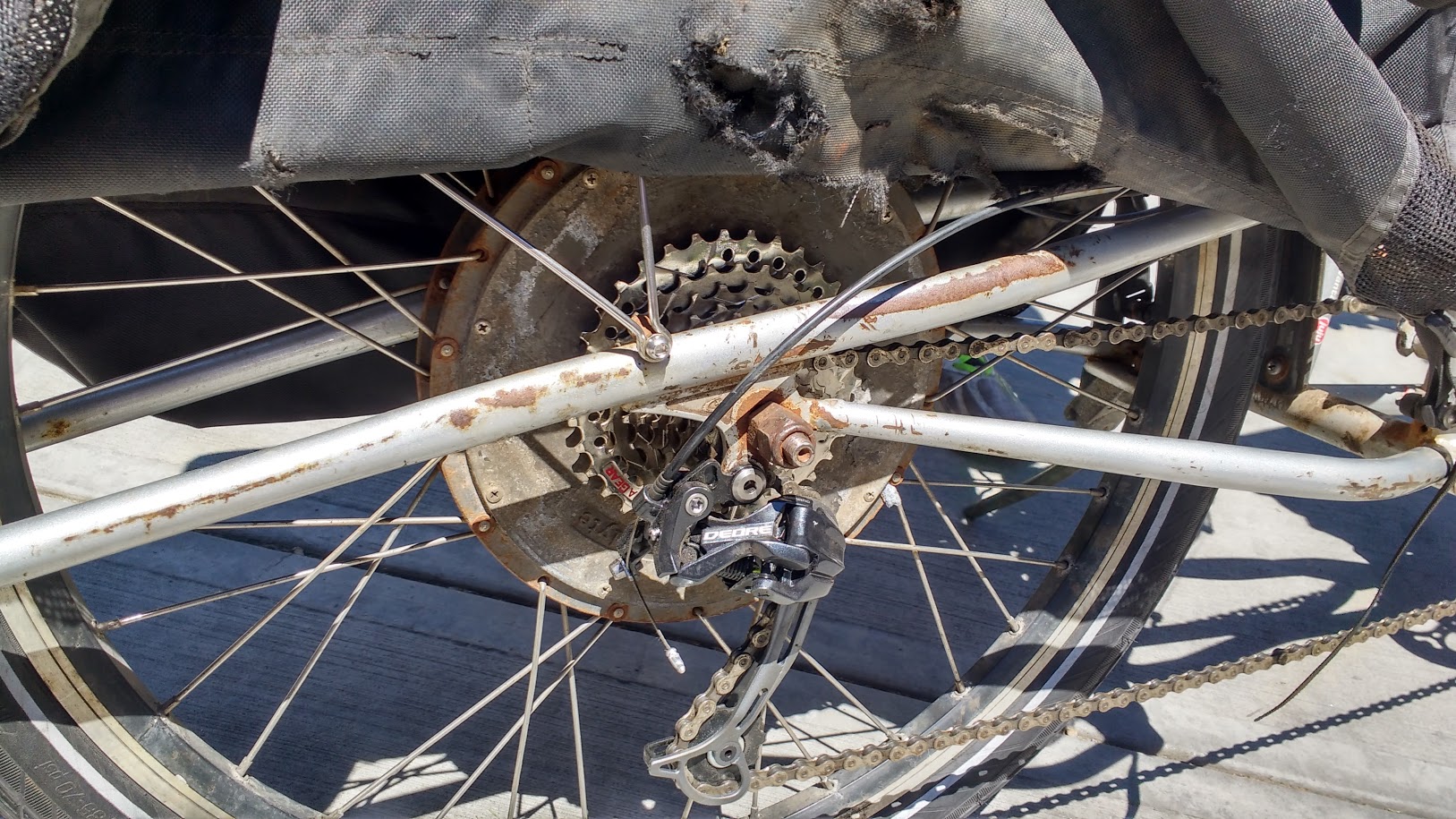 I headed out into traffic and headed for the nearest steep hill that was over a 10 degree grade. I expected the DD motor to quickly get bogged down, overheat and just stop working on me. This model of Crystalyte is not supposed to be fed over 2000W for any real length of time. Luckily the hall sensors had been fried a long time ago and Larry has more than got his milage out of this particular motor. The case was badly corroded and starting to warp at the seams. I think secretly he wanted me to kill it for him so he could buy something even more powerful for himself.