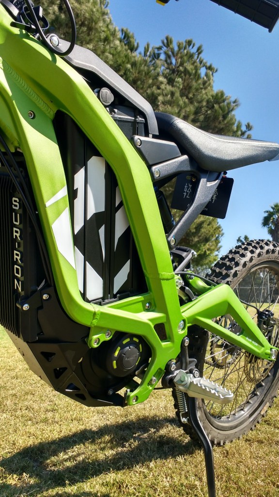 I was impressed at the craftsmanship in the frame and all the rest of the bike. Things seemed solid and built out of real quality components, not the usual hot glue and cheap ass crap you usually see come out of China. I honestly have no idea how they are able to build something at this level of quality and sell it for the price that they sell it for, but that’s China for you. A comparably sized new gas bike will run you about the same price and if you want a Zero you will end up paying at least twice the price. For someone looking for an inexpensive dirt bike that is fun to ride and will require almost no maintenance then the Sur-Ron is an excellent choice. The other nice thing about electric dirt bikes is that you can let them sit over the winter and there is no gas to gel up in the carb. The battery is easily removable (with a key) so you can bring it inside to charge or store for the winter.