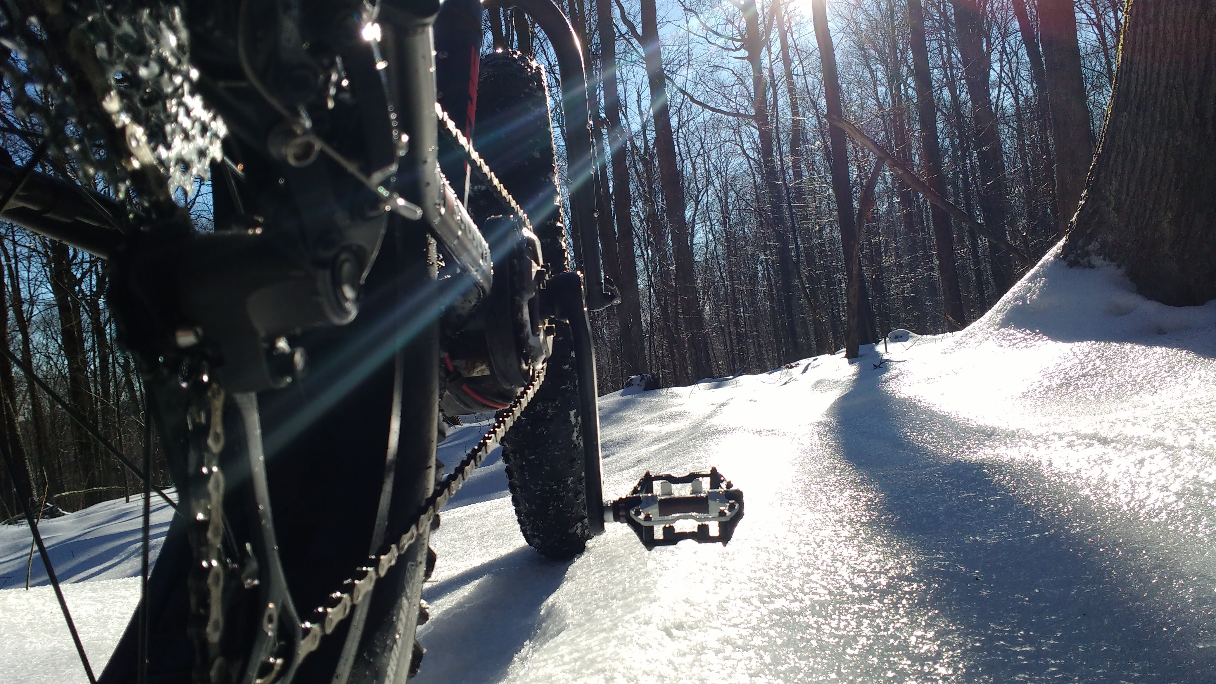 Powder – 4 : While the Snowshoe XL does well when the snow is wet, crunchy or hard, it struggles when there are several inches of freshies and the temps stay cold. I ended up keeping a front Surly Bud rim and the Snowshoe XL studded tire and would swap back and forth based on the conditions.