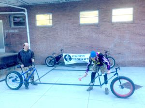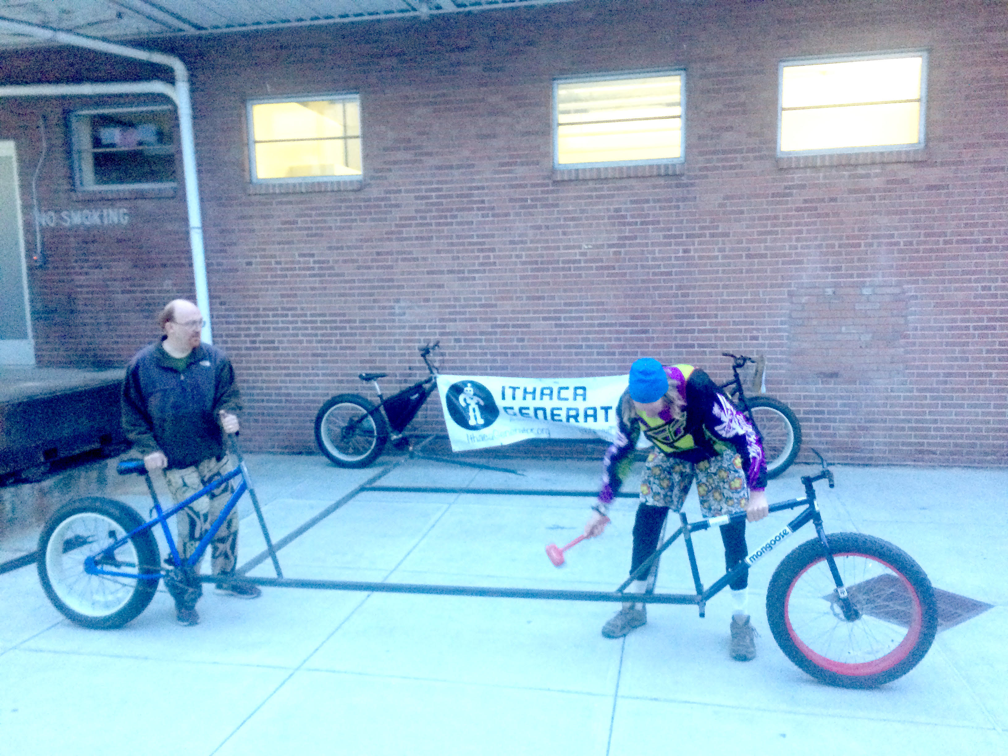 Laurence was the TIG welding ‘expert’ so he guided us through most of the welding process. We took turns making laughably bad welds on the TIG welder, but at the playa nothing fell apart, so I guess that’s something. When we finished the first 14′ long ebike we took it out for a spin on the streets of Ithaca at night. It handled even worse than I thought a crappy ebike that was 14′ long and had 2 people on it would handle, so we ended up adding a top bar to keep the bike from twisting so much when we rode it. When welding you want to focus on building as many triangles as you can as triangles are the strongest shape that don’t contort under pressure. We bought most of the tubular steel at the bulk steel place and it was shockingly cheap (but it is also dang heavy).